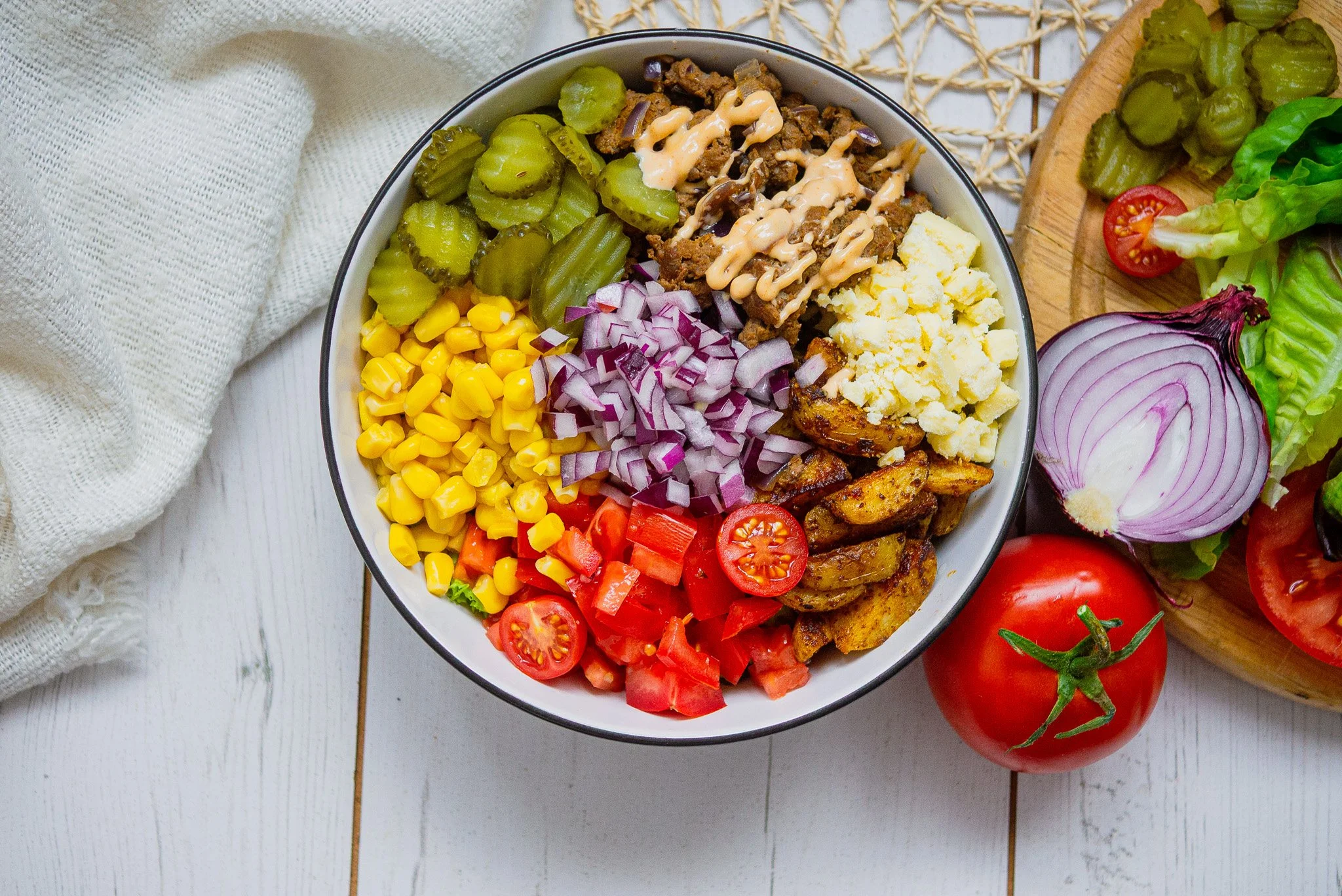 A loaded burger bowl swaps the bun for a bowl. It layers burger beef, fresh veggies, cheese, pickles and burger sauce for a low-carb twist on the classic burger.